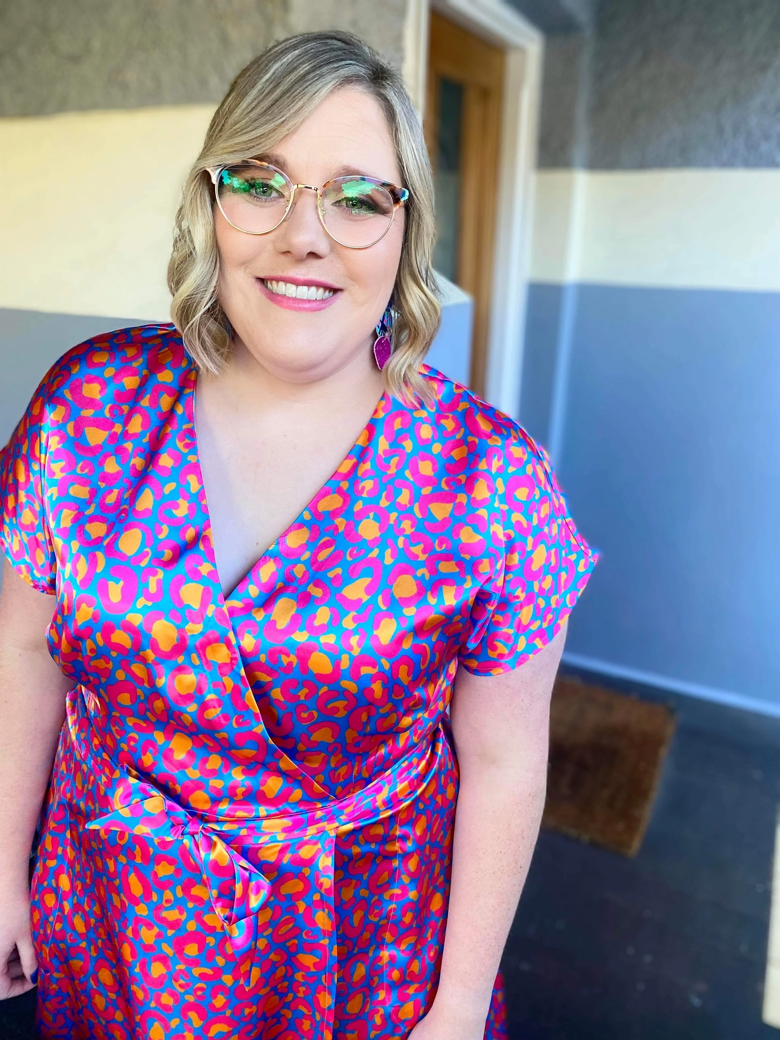 Leopard print in blue, pink and orange by Suzz in Colour, printed on Spoonflower satin.